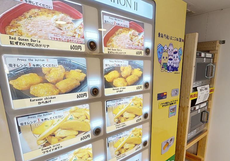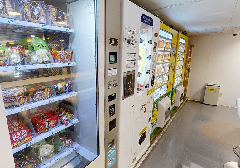 自動販売機では、パン、軽食、柿の種、キットカット、インスタントコーヒーなどが売っています。